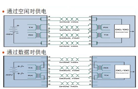 POE是通過CAT.5及以上的網(wǎng)線,在差分線上傳輸數(shù)字網(wǎng)絡(luò)信號(hào)的同時(shí),給PD端進(jìn)行供電。POE供電方式通常有2種方式,如下圖所示:第一種用到8芯網(wǎng)線,利用4、5、6、7號(hào)空閑端進(jìn)行電源傳輸,信號(hào)與電源是分開傳輸;第二種用到4芯網(wǎng)線,即利用1、6數(shù)據(jù)端即傳輸電源也傳輸數(shù)字信號(hào),實(shí)現(xiàn)信號(hào)與電源疊加傳輸。